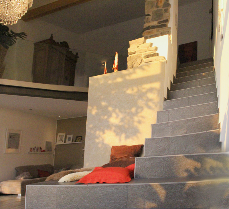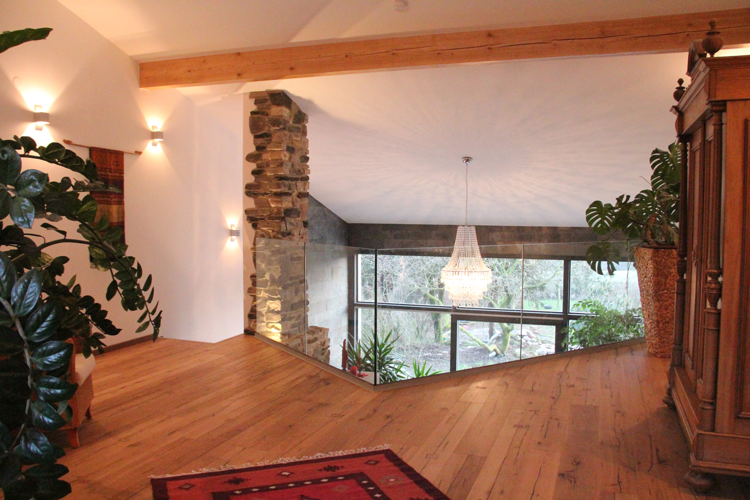 Der Umbau eines Mehrgenerationenhauses aus den 70iger Jahren, wurde so geplant, dass das Wohnzimmer mit Galerie der zentrale Treffpunkt der Familie wurde. Rund um den Kamin, dem zentralen Raumelement ordnet sich die Treppe und die Galerie. Die Form der Galerie wurde bewusst als schräg im Raum stehendes Rechteck gestaltet, da so die Dynamik des Raumes mit dem schrägen Dach nicht konterkariert wird, und das Wohnzimmer keinen „Schwimmbeckencharakter“ erhält. Der hintere Anbau wurde für die Großeltern altersgerecht umgebaut. Die aus den 70iger Jahren stammende kleinteilige Raumaufteilung mit langen Fluren wurde geschickt umgestaltet. Die einzig tragende Wand wurde beibehalten, so dass ein großer Wohn- und Essbereich mit offener Küche sowie ein behindertengerechtes Bad mit einem Schlafzimmer raum hatten, Der große Eingangsbereich ist mit einem Einbauschrank ausgestattet, der aus Schranktüren alter Möbel zusammengesetzt wurde. Dieser Stil wurde auch für die Küche verwendet.