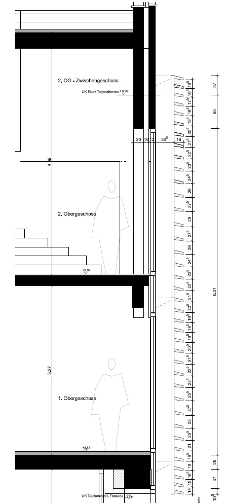 Das 1982 gebaute Kino Eldorado in der Steinenvorstad 67 wurde von der Besitzerin, der Swiss Finance & Property AG radikal umgebaut. Innen wurden die Kinosääle entfernt und mit einem Restaurant und Fittnesstudio ersetzt. Auch äusserlich musste man im Zuge der Sanierung der Glasfassade von dem angestaubten Image aus den 80iger loskommen. Eine Lösung zu finden, die die doch noch intakte sandsteinrote Waschbetonfassade beibehalten könnte, war Wunsch, um die Kosten nicht ins Unermessliche zu treiben. Neben einer Verkleidung mit Stahlgewebe entschloss man sich letztendlich für einen Vorhang aus lammellenförmigen Betonelementen. In detailierter Arbeit wurden Form, Aussehen Abstände und Überstände sowie die technische Lösung diese zu befestiguen bestimmt. Dabei bin ich von der Überlegung ausgegangen, möglichst viel Ausblick und wenig Einblick zu gewährleisten und wählte so den Winkel der Elemente. Die Abstände wurden danach bestimmt, dass die Geschossdecken verdeckt sind und die Aussicht von den Fenstern möglichst frei bliebt; deshalb die zweifache Öffnung der Fassade. Ebenso wichtig war mir, die Fassade nur so weit aufzulösen wie nötig und nicht zu filligran wirken zu lassen. Die Lamellen sollten sich nicht zu weit von dem muralen Charakter der Steinfassade entfernen und vermittelnd wirken zwischen der transparenten Fläche und den Betonelementen. M it S imulationen i n 3 d w urde die fast eine Million teuere Fassade versucht zu erfahren, um die beste Gestaltung zu wählen. A uf der ersten Seite ist die echte Fassade, auf dieser Seite die Simulation zu sehen.