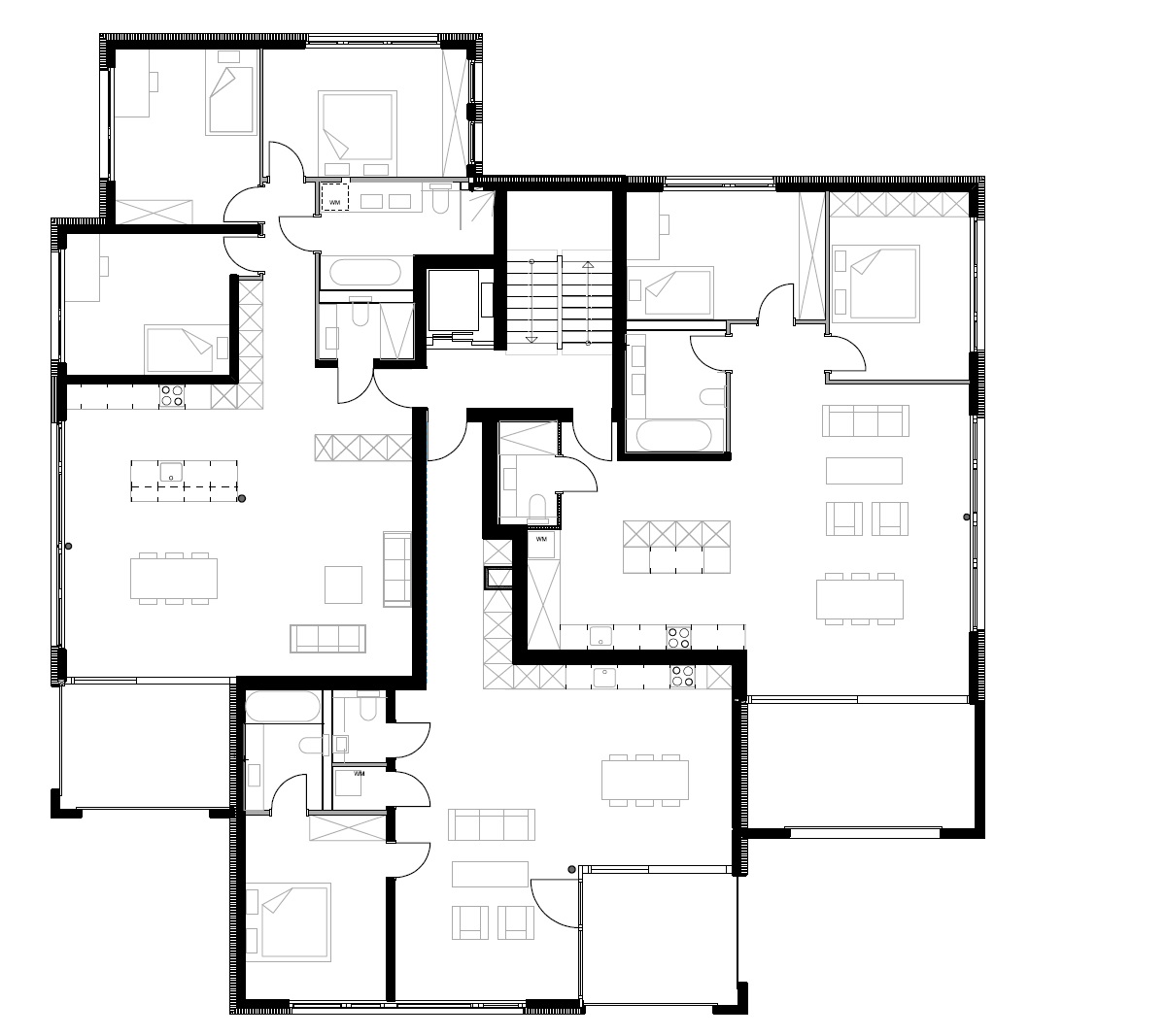 Auf einem innerdörflichen Grundstück das mit alten Scheunen bebaut war, sollte in möglichst kompakter Form und somit rentabler Wohnraum entstehen. Mit einer entsprechenden Gestaltung der Fenster und den grosszügigen Öffnungen, sowie einer gekonnten Farb- und Materialwahl strahlen die Wohnungen trotzdem eine Eleganz aus. Die Treppenhäuser erhielten einen nicht alltäglichen Charme. Dort wo sich die Treppenläufe um den Aufzugsschacht winden, wird dieser durch entsprechend gesetzte Lichtquellen und Materialität als eigenständiges Objekt betont. im zweiläufigen Treppenhaus wird das durchlaufende Webnet wie einen Vorhang gesehen und entsprechend gestaltet.
